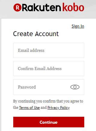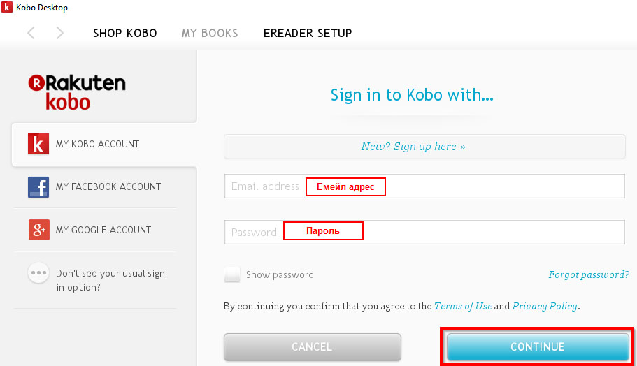 В открывшемся окошке "Sign in to Kobo with…" (Войти в Kobo с…) Вам нужно ввести ваши емейл и пароль, которые Вы использовали при регистрации аккаунта, а затем нажать кнопку Continue (Продолжить).