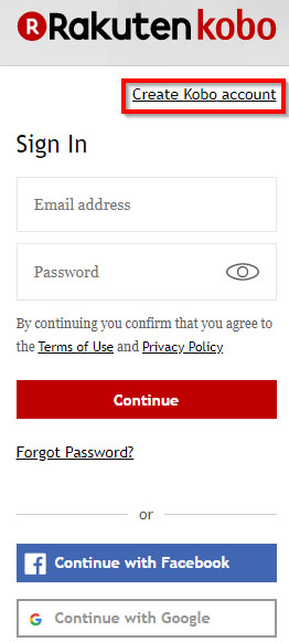 Вы можете создать аккаунт нажав на линк "Create Kobo" account. При этом откроется диалоговое окно Create Account.