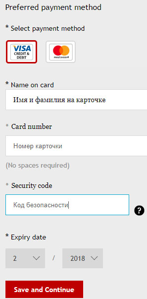 Затем Вам нужно будет выбрать предпочитаемый Вам метод оплаты (Preferred payment method) - Visa или Mastercard. Ввести свое имя (Name on card), так как оно написано на Вашей карточке, ввести номер карточки (Card number) и трехзначный код безопасности карточки, находящийся на ее обратной стороне, а также срок действия карточки (Expiry date). После этого Вам останется только нажать кнопку "Save and Continue" (Сохранить и продолжить).