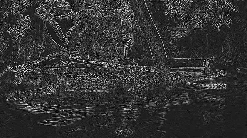 Обычно крокодилы меня не вдохновляют :), но с этой фотографией захотелось поэкспериментировать. Применяя фильтры в Adobe Illustrator или в Adobe Photoshop, можно получить очень интересные эффекты. Самый простой – это превратить фотографию в черно-белую, вырезать необходимую часть фотографии, сделать расплывчатыми ее края и использовать ее для принта на ткани. Ну, например, поместим ее на джинсовый жилет :).